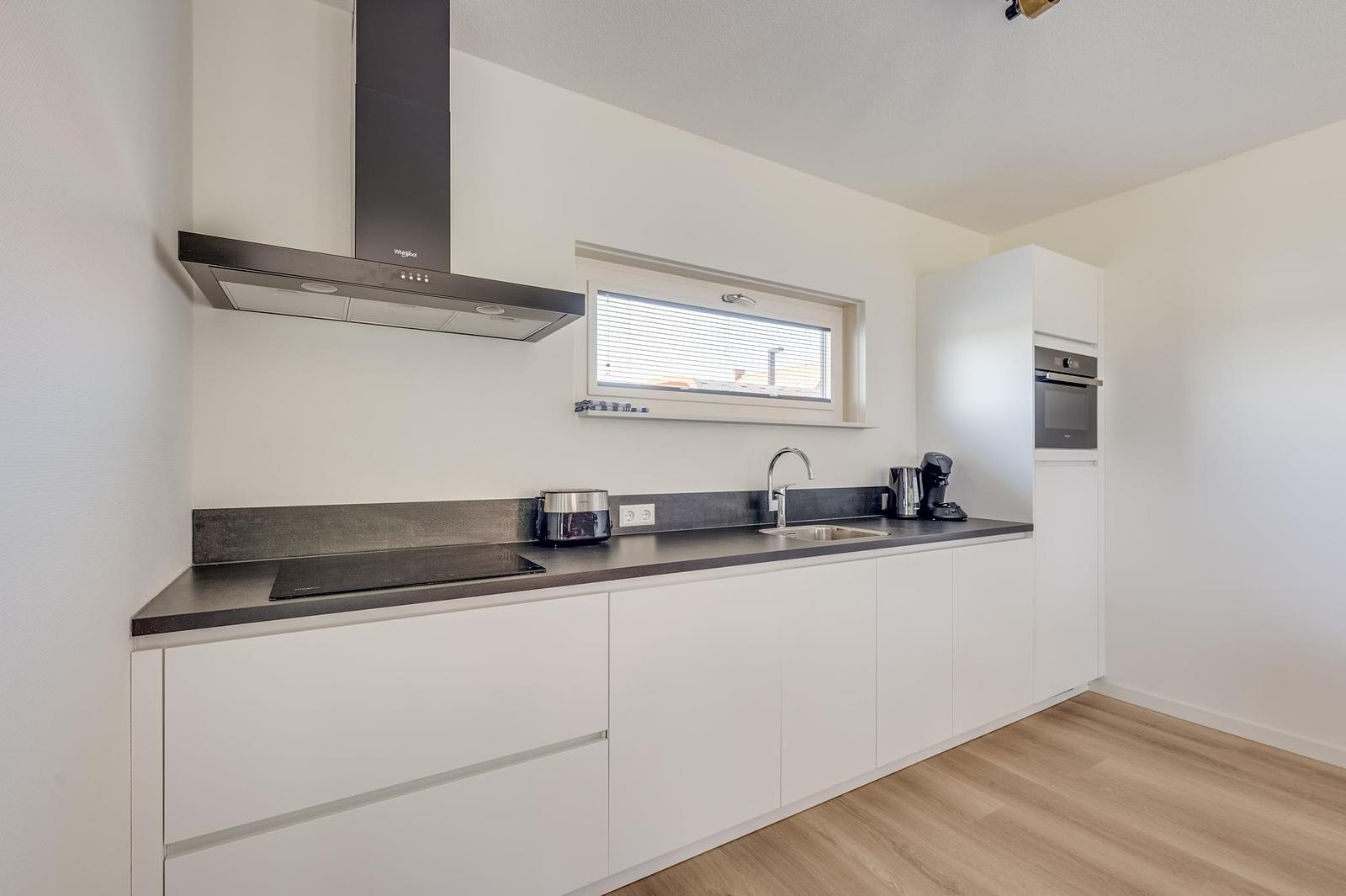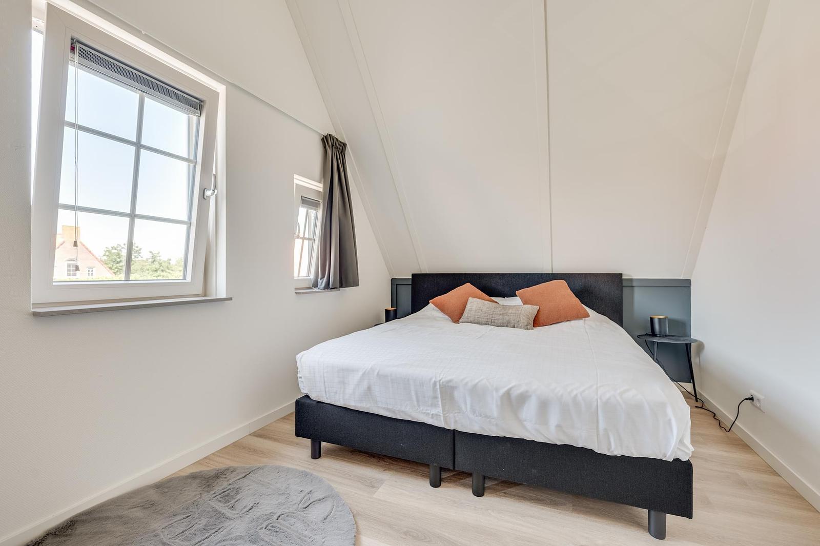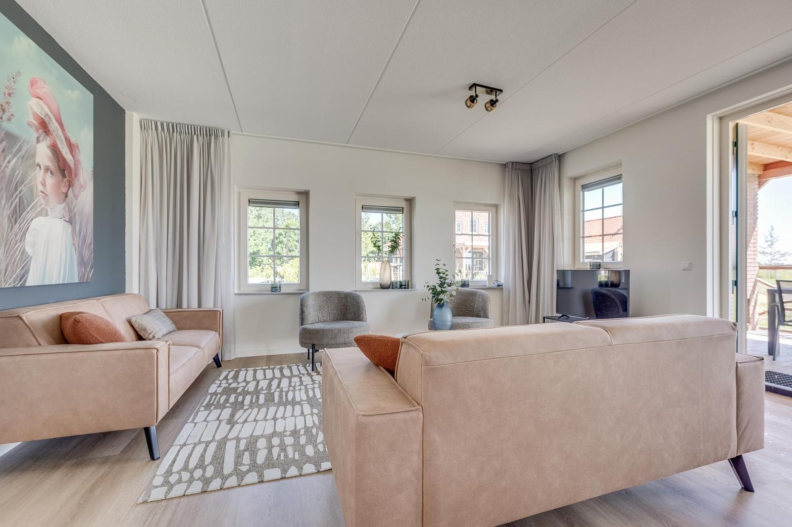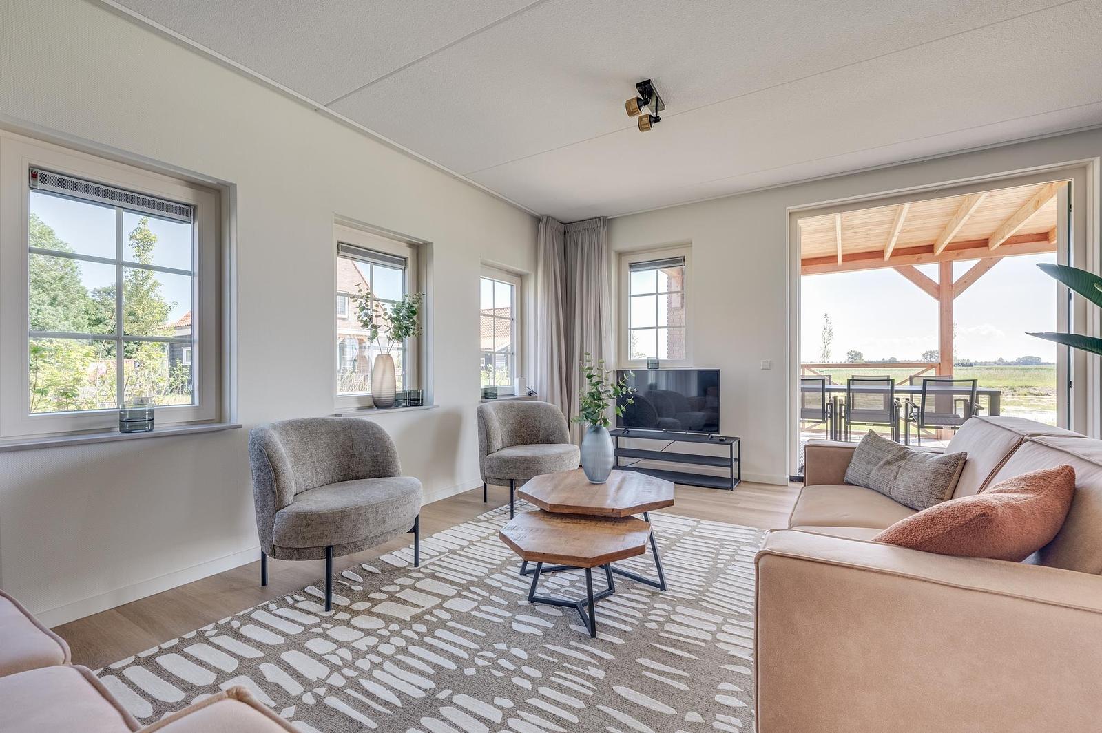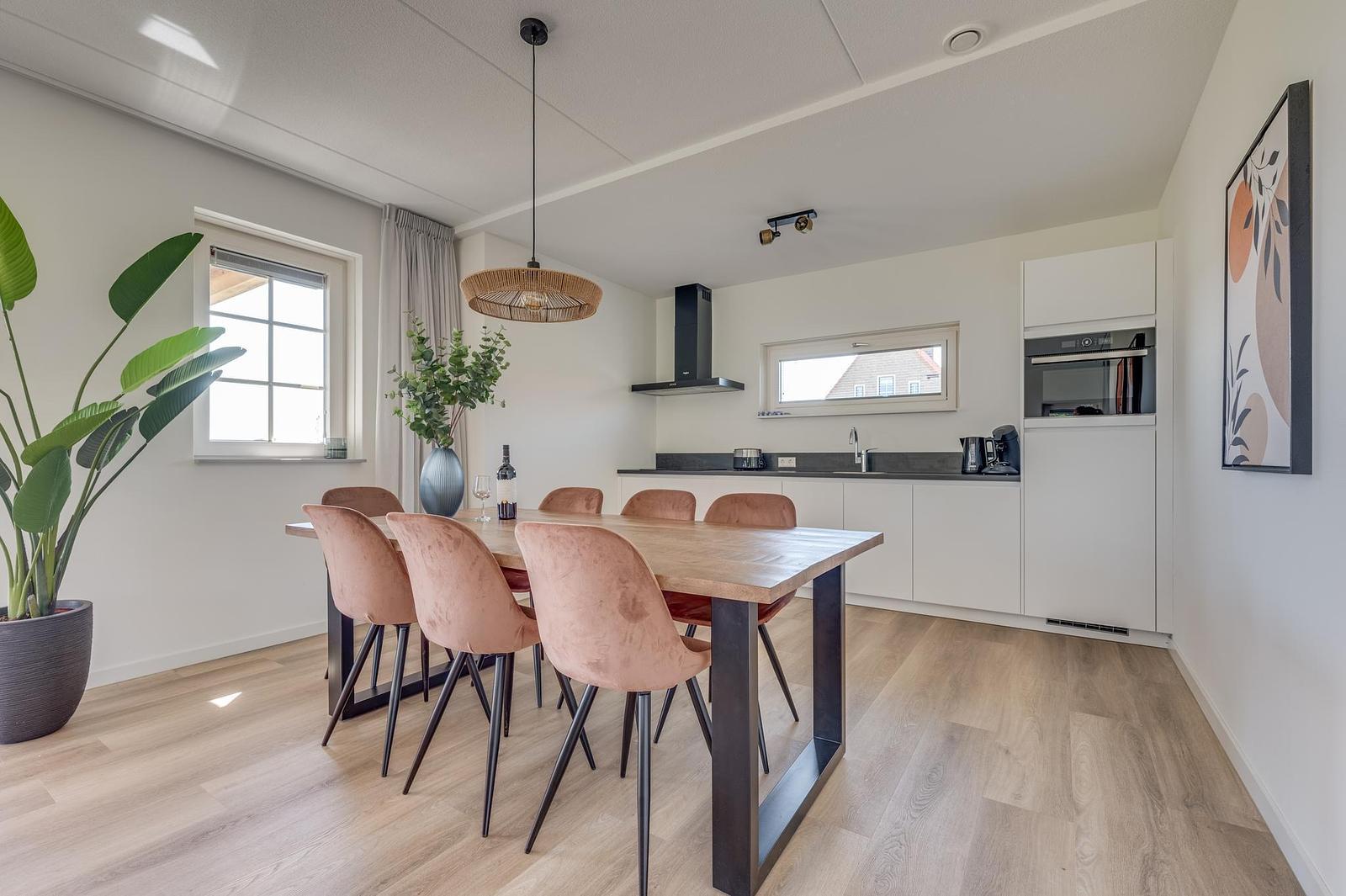 Inside, you’ll find a modern kitchen with combi oven, dishwasher, fridge-freezer and coffee machine, a comfortable sitting area with flatscreen TV, a stylish bathroom, and bedrooms with soft boxspring beds to ensure restful nights. Everything is arranged for comfort and ease.